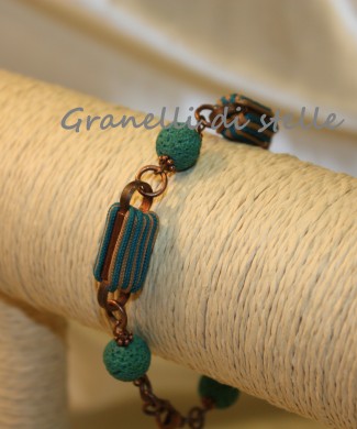 Bracciale casual e sportivo che ricorda i colori del mare. Bracciale realizzato con pietra pomice cilindri di rame rivestiti di cordoncino.