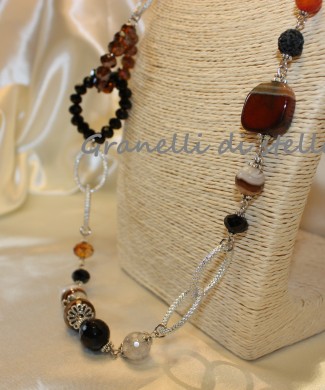 Collana realizzata con catena in alluminio, pietre naturali e cerchi in mezzi cristalli.