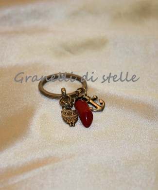 Portachiavi portafortuna con corno in corallo, ancora e gufetto