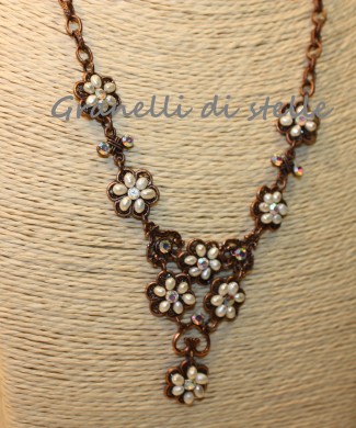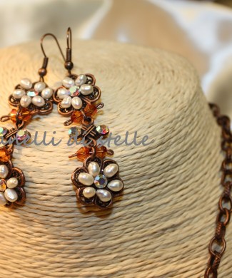 Parure Completo in stile medievale in rame, fiorellini con perline di fiume, strass e bicono Swarovski
