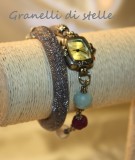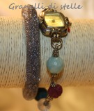 Orologio-bracciale 2 in 1, per chi ama la praticità ma vuole rinunciare allo stile. Orologio doppio giro con quadrante rettangolare argentato, cordone di perline e pietre naturali. Disponibile in vari colori.
