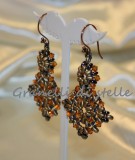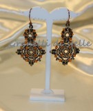 Orecchini eleganti e raffinati, realizzati con la tecnica della tessitura, con perle minute e Swarovski, nei toni dorato, ambra e blu.